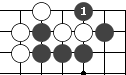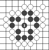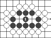 如果在没有气的交叉点上下子的同时能使对方也没有气,这种情况下非但可以下子,而且可以提掉对方的棋子。如下图白子下在1位,虽然旁边没有气,但因为黑棋同时也没有气,因此非但可以在此处下子,而且可以把八个黑子提掉。 二:围棋的技巧