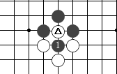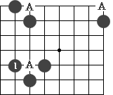(1):门吃 黑1打吃,白两子就五处躲藏了,白如硬在A位长,那就会损失更多我。像这样两边各一个子如同一扇大门一样的吃子着法叫"门吃"。(如图9)