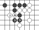 1:利用打吃 图33:白△断,企图吃掉一个黑子,黑应怎么办呢?黑1打吃,白2长,这时黑3赶快连就逃出去了。