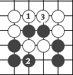 图38:两个黑子和两个白子相互包围在里面,都是死棋,各有两口气,胜败是决定在哪一方先紧气。黑方先紧气,自黑1到黑3,黑方把两个白子吃掉。