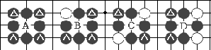 (2)黑占了三个角点,B点也是真眼。 (3)黑只占了两个角点,而白占了另外两个角点, (图49) 这样C点是假眼。