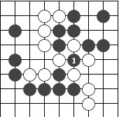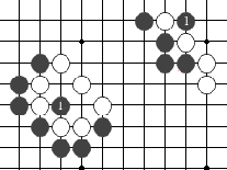 图74:黑1是做活黑棋"刀五"眼形的最好点。黑棋看起来眼形很大,但如果轮白方下,仍能点杀死黑棋。白1是点死黑棋的要点。