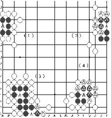 (3),黑方边上的A点,由于黑△子已呈叫吃状态,黑方只能在A点接住,同样可看出,边上这个A点是黑方的一个假眼。