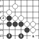 图55:此图极为常见,点三·3后往往走成此形。1位是较好的点,眼位丰富。黑1虎,白2如扳,或a位立,黑均走3跳,黑净活。