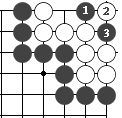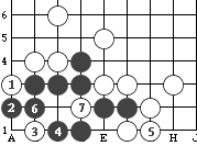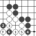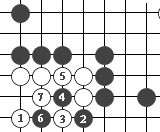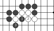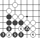 如图7,黑1打吃,白2长,这时黑3双吃,肯定能吃到两个白子。 (图7)