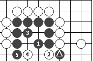 图66:黑先活。黑1曲。白2扑,黑3做眼,白4点。黑5立,因为黑有△一子,使白无法救出白4,黑活。当然,白杀不掉对方,应在3位点,求双活。
