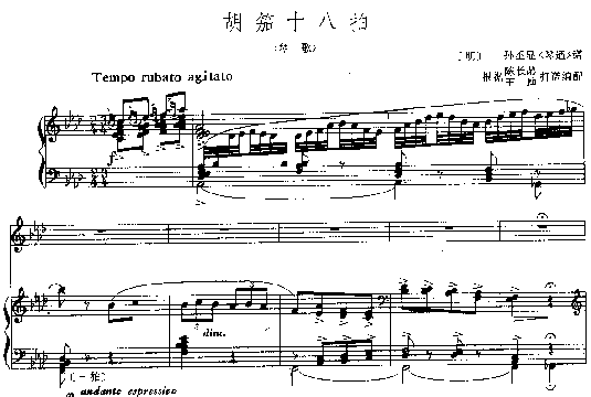 《秋风词》等。琴歌的体栽一般来说较琴曲为短小简单。 例如:《胡笳十八拍》(片段)