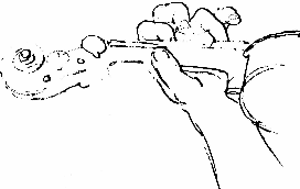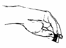b:拇指练习 有右手食指代替小提琴,把它放在左手拇指的指肚上,有点向左面推拇指指骨上端,直到拇指相当垂直为止。