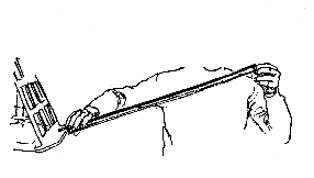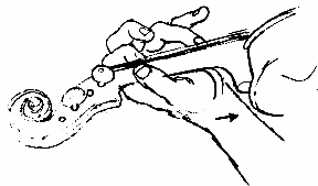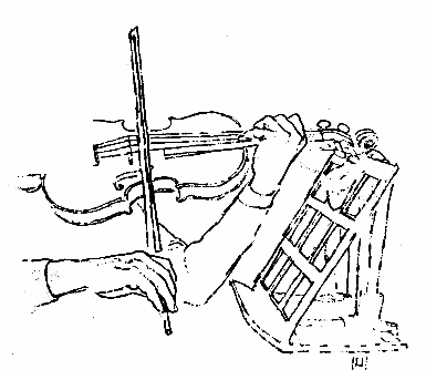 把弓根放在一个谱架上,如图11,用左手扶住弓尖,右手轻轻地放在弓根。然后右手自然变成舒服地姿势。应注意地是:演奏者的肩膀和肩胛骨在下弓动作中应该跟随手和手指运弓,在上弓动作中,则应给运弓的手留出余地。