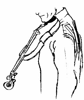 弦上。头朝后缩,不再需要支撑琴而轻轻地放在腮托沙锅内,只是刚好接触腮托以防止小提琴滑离开锁骨。接着把小提琴举起,和地面呈平行的姿势(略高些),把头部临时从腮托上抬起,调整头部和小提琴的新角度,并重新放回腮托。肩部应保持自如下垂,在肩部和小提琴之间应留有。最大限度的空间。