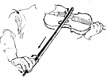 右手大臂拉弓带动运弓;这部分动作能够单独演奏一种短音符的sf;也可以用在弓子的任何部位或其中很小部分,甚至用在一个全弓的快速动作中,无论强音或弱音。