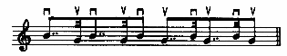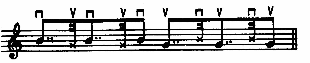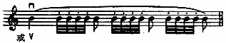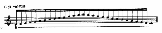 我们把弓子拉得比起弓慢些,四个音符跳弓后,用小指压制力结合一种相反方向的突然动作把弓抬起离开弦,然后 控制住弓子。回拉出如图音型。 图39 L:击跳弓