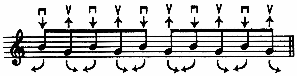 练习在两根弦上的起伏动作,五个音一弓。音符上面的箭头指的是手指关节的高度,音符下面的弯曲箭头指的是拇指的姿势。在下弓动作中,手指关节趋向扁平的姿势,在上弓动作中,手指关节趋向