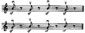 从两个音一组连弓弱奏开始 ,在较低的音上响亮地突然结束。上弓时,从低音弦再次弱开始,在高音弦突然停止运弓动作,每次做一个由弱到强的渐强。