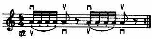 凸出的姿势。 图28 E:分弓弓法的附点节奏 如图29: 采用一种附点节奏的弓法。