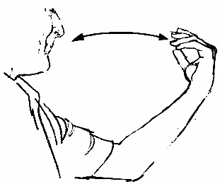 伸出双臂再落回 肩胛骨的动作。 双臂向两侧水平伸直,转动双肘部,在这个动作中,当手臂围绕肩膀转动时,双手掌心向下,保持不动,同时伸直手掌和手指。做这个动作,要结合向前伸展和转动双肩,手臂交替进行,把头转向伸展的手臂;然后做一个补充的转头动作,离开伸直和转动的手臂。接着,同时向前转动