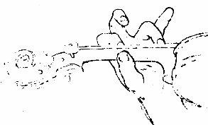 (2)右手的准备练习: A:演奏姿势中弓杆的平衡 用左手一点一点地向左移动手指中地木棍,经常放开左手,其它手指要始终保持松弛。