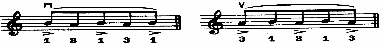 用一弓拉,先下弓后上弓,连续拉一个持续音符,接着一次用力拉三个快速音符为一组。持续音符应该保持足够的长度,使右臂在用力后彻底放松,声音要保持不断。