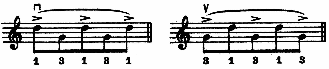 这些练习相隔一个全音应该在两根弦上用左手手指按住两个音来练习。需要换把,不用伸指。除了与下弓和上弓运弓动作相关的一般身体摇摆外,在每一个强调的音符上让身体略微有一点转动。