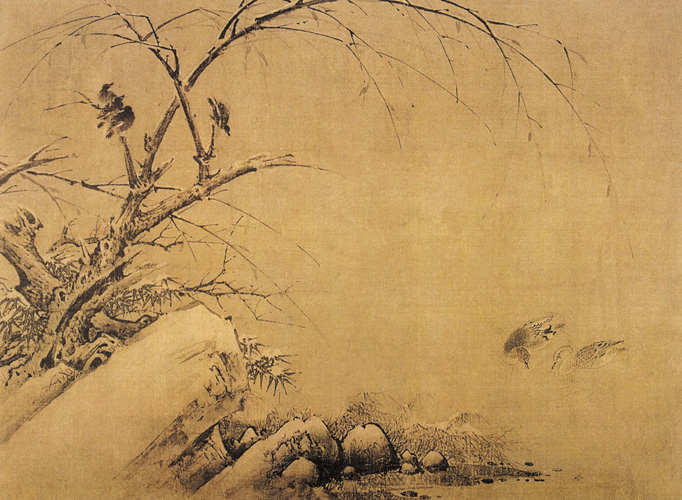 黄筌对后世工笔花鸟画起了开拓和奠基的作用。图中画水边数石叠起的岸上,所有景物,其上都布满积雪,皑皑一片,柳枝竹叶亦在积雪中努力伸展。池塘上,雾气一片,水天一色,一片清寒静寂的景致,在静寂中又寓有生机。画中笔法奇峭,精细而又简洁,石的画法简练含蓄,竹树则枝叶具体,而寒鸟和双鸭则更生动传神。画中用墨洁净,设色简淡,是一种与其精工富丽完全不同的另一种画风。