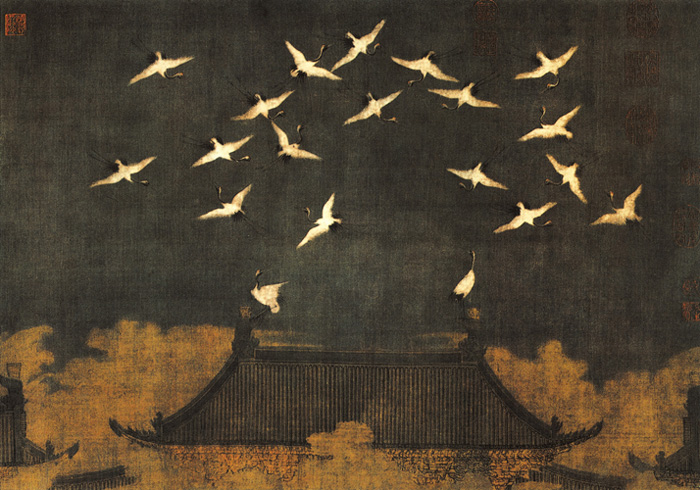《瑞鹤图》表现的是在庄严耸立的汴梁宣德门, 门上方彩云缭绕, 神态各异的丹顶鹤翱翔盘旋, 空中仿佛回荡着悦耳动听的仙鹤齐鸣的声音。 宋徽宗的书法风格挺健秀丽, 称瘦金体, 在书法史上独树一帜。此画就有宋徽宗的瘦金书题诗并记:“清晓觚棱拂彩霓,仙禽告瑞忽来仪;飘飘元是三山侣,两两还呈千岁姿。似拟碧鸾栖宝阁,岂同赤雁集天池;徘徊嘹吠当丹关,故使憧憧庶俗知。御制御画并书。”签押“天下一人”。