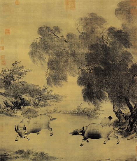 此图描绘风雨将作时,二牧童赶牛回家的情景。画中场景简洁,却烘托了极充实的情境,整个牧童、牛、大树、湖水、苇丛等景物都被置于忽来的风雨主题与气氛之中。画中笔墨精细,有工有写,尤其两牛身上的细毛能一丝丝勾出,密而不乱,又足见画家描绘事物的深厚功力。此外,画中用墨、设色均轻淡细腻,极好地表现了两牛形体、骨肉的细微变化。