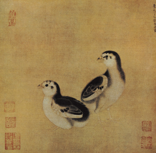 此图原载《宋人名流集藻册》(见《石渠宝笈续编》)。上题云:《庆元丁巳岁李迪画》。按宁宗庆元丁巳是1197年。迪如于宣和末年(1125)在画院,其年龄为30岁,则到了庆元丁巳,他已是过百岁的人了,怎能画出这么体物入微的这幅 《鸡雏待饲图》来呢?他当是与马远同辈的人,是一个唐、宋朝(1190-1224)的画院待诏。此作当是他盛年的作品。