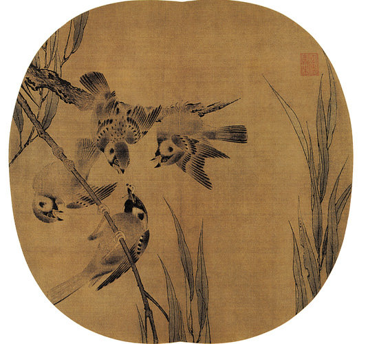 此画状写了杨柳枝上幼鸟嬉戏的场景,很是清新生动。画中幼鸟描绘简括传神,头足以浓墨点染,双翅以浓墨勾写,中以淡墨晕染。幼鸟姿态的高下、腹背、俯仰、升沉,俱臻精妙。而柳枝的疏宕、交叉、穿插、飘垂,亦笔笔精到,不可增删。