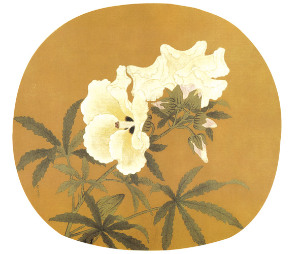 画面无署名,南宋人作。写秋葵一枝,工笔勾勒填彩,花瓣用粉细勾,叶用重绿,姿韵生动,重彩渲染,布局严谨。两朵开着的花与疏疏的叶子,充分表现出秋葵的神态,是南宋写生佳作。
