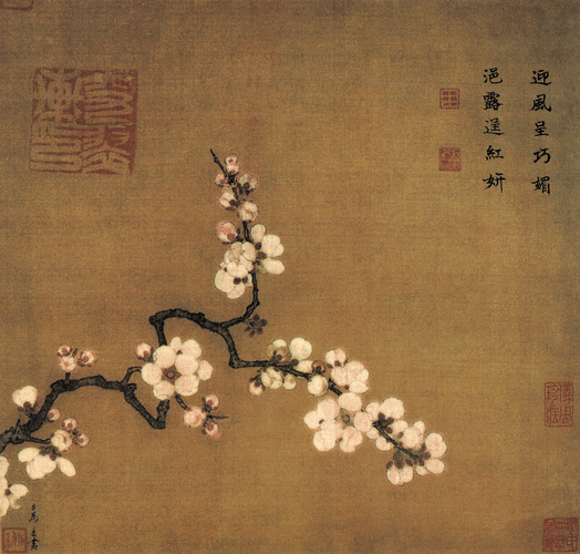 《倚云仙杏图》可以看出马远花鸟画的基本面貌,用笔工整,设色浓重。此图只画出从画幅左下角伸出的花枝的一部分,这种局部描写的构图手法,与他的山水画中的“一角”、“半边”处理有相通相似之处。花枝曲折横斜,然后一分枝指向左上,一分枝指向右下。枝条以细笔浓墨钩勒,再施以水墨渲染;枝上层层叠叠盛开的花朵、含苞欲放的花蕾则施以厚重的白粉加淡红,萼片施以紫色。整个花枝既有曲折多变而挺秀的姿态之美,又透露出几分华贵之气。