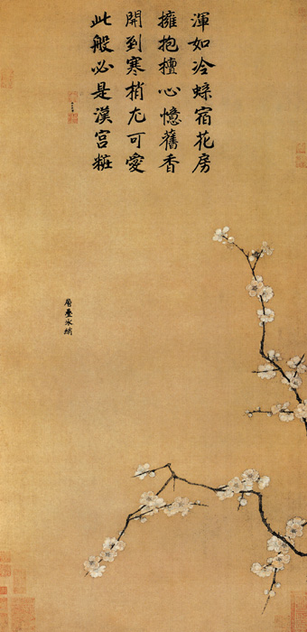 此图是马麟花鸟画的存世名作。描绘绿萼梅两枝,一俯一仰,婀娜多姿。据称,绿萼梅花萼、蒂纯绿,枝梗带青,系梅花中极名贵的品种。画面梅开似玉蕊占风,琼葩含露,绰约玲珑,清幽冷艳。扶疏的瘦枝玉蕊清冷,暗香浮动,为典型的“院体”宫梅。画家以钩勒法淡墨细线写出花瓣,再层层填色。以水墨绘枝,重彩染花,强烈的对比映衬,生动地体现了寒梅冰肌玉骨之美。