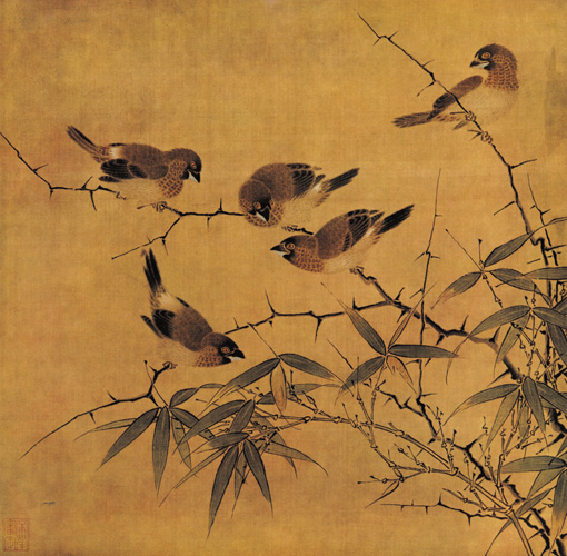 此图原载《宋人集绘册》,见《石蕖宝笈三编》,无作者落款。画冰天雪地中昂然挺立的雪竹与不畏严寒的幼鸟。画家运笔流畅遒健,竹叶双钩,鸟的羽毛也勾勒而出,很见骨力。工笔之中却具放逸,粗看似拙,细审则精浑。