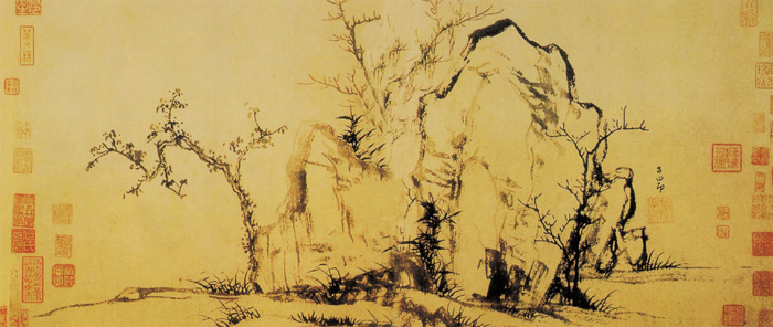 画面采用横披式布局,将巨石置于画面中央,重心偏右。整个画面布局平稳、疏朗大方。画家用笔极重写意,气韵流畅,不拘形似而又不离形外,极讲法度而又处处不拘定法,自由随意而又形神毕具,淋漓酣畅而节制有度。图中墨色,浓淡枯润,变化丰富,于物、于景、于情、于意能融合无间并充分呈现,最终映现出画家萧疏淡远的心性。