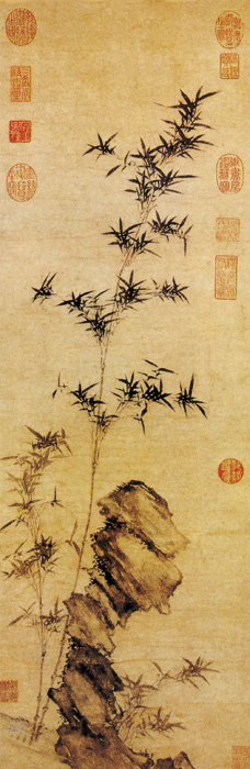 管道昇画竹,元代颇负盛名,用笔尖劲,格调爽利秀挺。《竹石图》画修竹二竿和怪石。管道昇画竹有一特点:在用墨上不求变化,竹叶并无层次,都用深浅一致的重墨表现。竹叶一笔完成,下笔略带藏锋,撇出先重后轻,叶片较为肥腴,叶间笔锋突出,较为尖利,行笔以中锋为主,偶有侧锋。最上边的竹叶作“燕飞式”,用藏锋笔法挑出,极为生动。