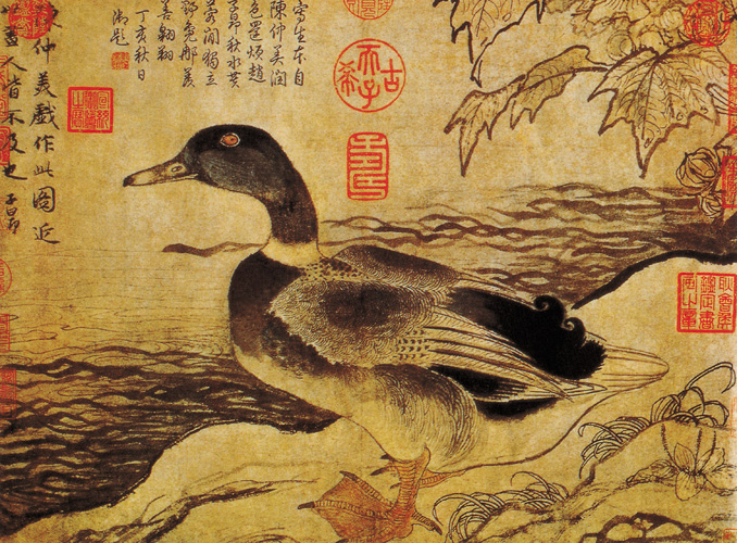 陈琳, 字仲美, 钱塘(今浙江省杭州市)人。生卒年不详, 父陈珏, 号桂岩, 南宋画院待诏, 擅画山水, 人物。陈琳自幼得父家传, 并得赵孟頫指授,他注重摹习古法, 又有所创新, 画名独步一时。《溪凫图》是陈琳唯一的存世之作。画溪边一绿头鸭, 作昂首观望状。鸭子毛色光润, 栩栩如生。溪边的花草水石及禽鸟的各个部分均用不同的笔法和墨色来表现物象不同时形态和质感, 工笔略带写意, 粗细兼用, 笔墨潇洒流畅, 浓淡墨色富于变化。 |