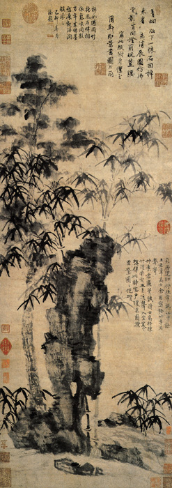《梧竹秀石图》画湖石瘦立,高梧疏竹,涓涓溪流。笔法雄阔,墨气湿润。似“逸笔草草,不求形似”。然神气俱全。画上自题:“贞居道师将往常熟山中,访王君章高士,余因写梧竹秀石奉寄仲素孝廉,并赋诗云:“高梧疏竹溪南宅,五月溪声入坐寒,想得此时窗户暖,果园扑栗紫团团。倪瓒。”