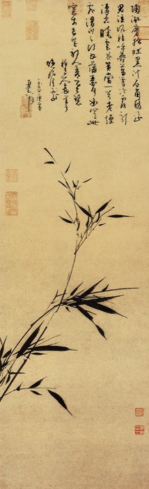 吴镇平素喜欢和僧人贫士为友,绝少与上层官僚士绅往来,纵情于山水之间,以诗文书画自娱。吴镇也酷爱竹,他常以竹入画,也留下了许多画竹佳作。此幅《筼筜清影图》仅取竹一枝,略施笔墨,竹影清风跃然纸上。配以本幅的草书题款,真正诗书画洽然合一。