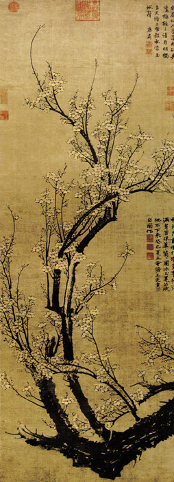 王冕爱梅,也善画梅。他画梅干,用笔遒劲,顿挫得宜。绘花瓣,或用浓淡水墨点染的点花法,或用双线勾勒的圈花法,或点、圈合用,变化多端,均能生动地表现出梅花的特有形态,并通过对梅花的刻画,寄寓或抒发自身的情怀、理想和抱负。《南枝早春图》画一折枝梅,枝干劲健,用浓墨填涂,显得气势雄劲。枝上梅花报春,迎春怒放,生机盎然而清新纯净。是一幅设色清丽、笔墨严谨的花鸟精品。