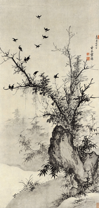 周文靖,莆田人。善画山水,画法师承马远、夏圭,与戴进等同一流派。而此幅是别开生面的作品,用笔遒劲,墨色浑厚,古木参天,寒鸦数点,写出秋林清旷的意境,颇有元人遗韵。