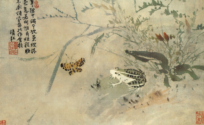 这也是郭诩出色的作品之一。描绘的是碧草丛中的青蛙蹲伏欲跃,蛱蝶张翅纷飞,生趣盎然。图册在表现技法上,显示出画家广博的才能。用写意的笔法,画出生动的景象,没骨碧草,苍浑多姿,杂以赭色几点,更显出新秋气氛。