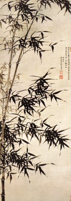 明初墨竹,宋克、王绂、夏㫤是并称的,而以夏㫤的声誉最为卓著,他画墨竹能尽得其妙,时推第一,名驰艺坛。《墨竹图》画风竹数竿。画家以劲利、巧媚中饶有韵致的笔情墨意,心平气和、全神贯注地行出竹的竿、踢出竹的枝、撇出竹的叶,偃仰起伏,浓淡疏密,前后穿插,交待得有条不紊,真实地刻画出竹子在秋风中飘举摇曳的情状。画上有画家自识和多方收藏印章。