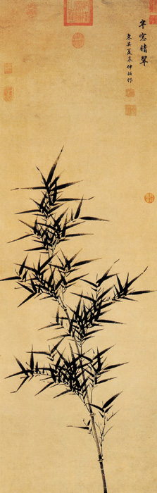 夏㫤的墨竹画,有着很深的功力,他继承了元人画法,也受到王绂的影响,到晚年稍有变化。此图虽只画竹半枝,却透着无限风光和满眼晴翠,画法也别具匠心,用笔苍厚,浓淡分明;笔势豪爽劲利,一气呵成,同时又讲究法度,能熟练地运用书法技巧,使每一枝叶的起笔和收笔都不失规矩。