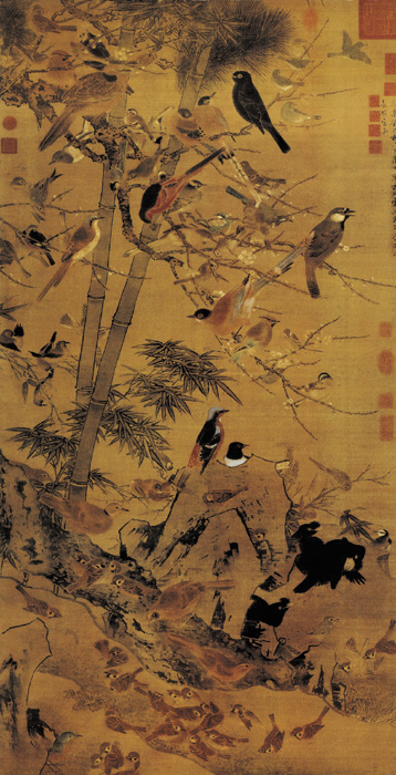 画题中的“三友”,指松、竹、梅三种花木,画家常常将花木人格化,借其自然特性比喻或象征人的品德气质。此图画寒冬季节,坡石旁两枝翠竹耸立上伸,梅枝从左上部与竹枝交叉斜插而下,枝头梅花点点竞放,禽鸟多而不乱,在繁复的构图中巧于安排。画家将象征傲霜耐寒高尚人品的“三友”与多姿多彩的“百禽”画在一起,其构思显然富有深意。