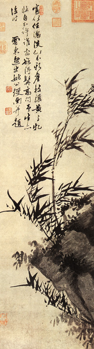 姚绶不但善画山水,对花鸟竹石也有很高的造诣。另外,他的书法苍劲有力,行书、草书皆善,他不仅是一位绘画高手,也不愧为一位书法大家。此图绘迎风摇曳的写意墨竹和泼墨山石,显得简率天真,逸气四溢,与画面画家的行书题款相得益彰,体现了中国古代花鸟画的形式美感和笔墨情趣。