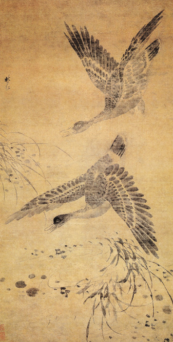 林良以擅画写意花鸟著称。早期所做设色花果翎毛,画法工细精巧,后来师承南宋放纵简括一路,变为水墨粗笔写意,取得突出成就。在表现技法上,挺健豪爽的笔法,既有迅捷飞动之势又比较沉重稳练;在运笔顿挫之间讲究规矩法度。此图描绘了两只向下飞翔的大雁,其身姿矫健妩媚,羽翼丰满,充满活力。