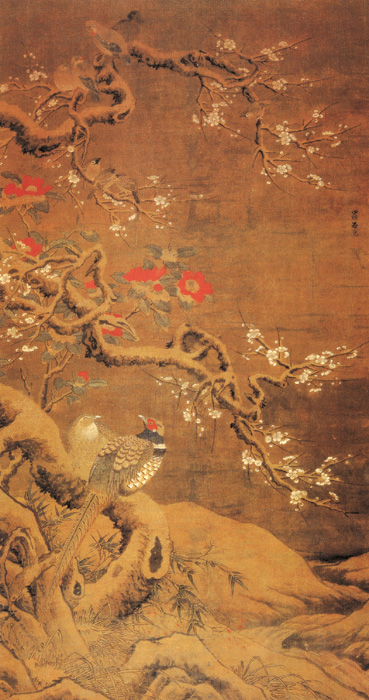此画描绘的是着色雪景,寒意茫茫。坡石上,有白梅老干攲曲,双雉栖息干上,一正一反,侧首相互呼应,形态生动。树根处,隐隐露出兰叶丛草,梅枝虬曲凌空,花朵疏密散聚,气势飞动,更添无限寒意。数雀聚集栖于上部梅枝之上,山茶红映其间,正如《无声诗史》所评“设色鲜丽,生气奕弈”。远处岗阜覆雪,涧水曲流,冷壑荒寂。此画属于工笔重彩一体,色彩浓重妍丽,覆雪山石皴染结合,明暗对比强烈,造成雪景冷寒之意境。