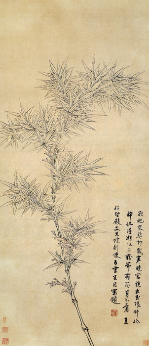 王臣,明代画家,生卒年不详,字世赏,曾官直仁智殿文思院副使,专长画竹。此图为一白描双勾竹图。图中画一竹枝自画面下边斜出,弯曲向上,顶端又低头朝下,中间丛叶左右生长,取得舒展均衡之势,写物虽简,但构图却极精心。画中笔法清隽硬朗,描绘物象尽其精细。清人庞无济曾云此图“用笔如铁画银钩,似在王元章之上”。又云“此图书画俱古,疑为宋人手笔”。