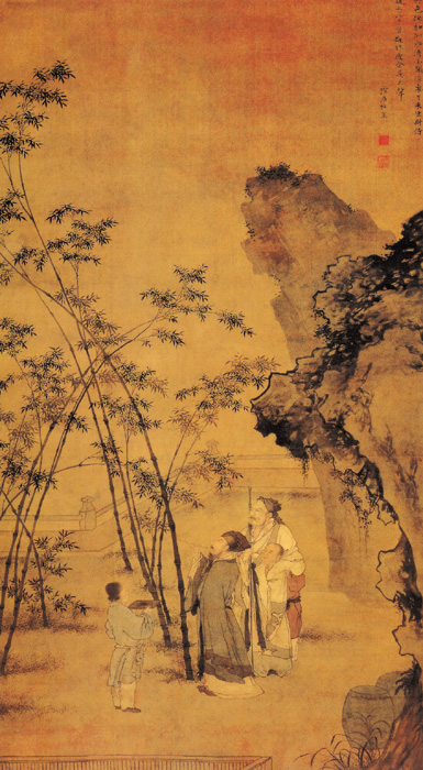 明 杜堇 纸本墨笔 纵191厘米 横104.5厘米 北京故宫博物院藏 杜堇,本姓陆,出继杜氏,字惧南,号柽君,又号古狂,丹徒(今江苏镇江)人。宗法李公麟白描法,线条纤细流畅,又别具秀媚之态,为当时白描高手。从画中题诗悉知此图绘宋代著名诗人苏轼题竹的故事。画面正中高帽长须、执笔题竹者即为苏轼。人物衣纹作兰叶描,又稍见转折和顿挫,纤细而有力。墨竹主干细加晕染,逐节分明,笔墨亦显细秀特色。唯山石勾皴较随意,多尖峭折角和方向不定的短皴,近似“浙派”戴进的山石,其画法似乎与“院体”、“浙派”有一定关系。 |