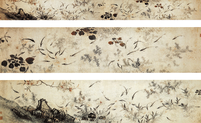王翘,其生卒年不详。字时羽,一字叔楚,号小竹,一作小竹山人,嘉定(今属上海市)人。诗宗孟郊,画工风竹、草虫,生动逼真。此画写群鱼戏水,水草丰茂,鱼群得意,追逐回旋,形态自然生动,卷末作重墨乱石倒垂花枝。以静济动,以重镇轻。画鱼以水墨写意法,先用淡墨一笔画出鱼身,再以重墨勾脊、画嘴、点眼,神出笔端,生动之至。水藻的形态浓淡,与鱼水交融,层次分明而又浑然一体。画自然之情趣。