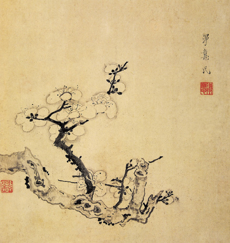 此图梅花的花瓣以墨笔勾圈,行笔迅疾有力,转折方硬,似不经意为之而疏落离披,层次清晰。画家以淡墨烘染质地,借助绢素本身的洁白来留出梅花的形状。